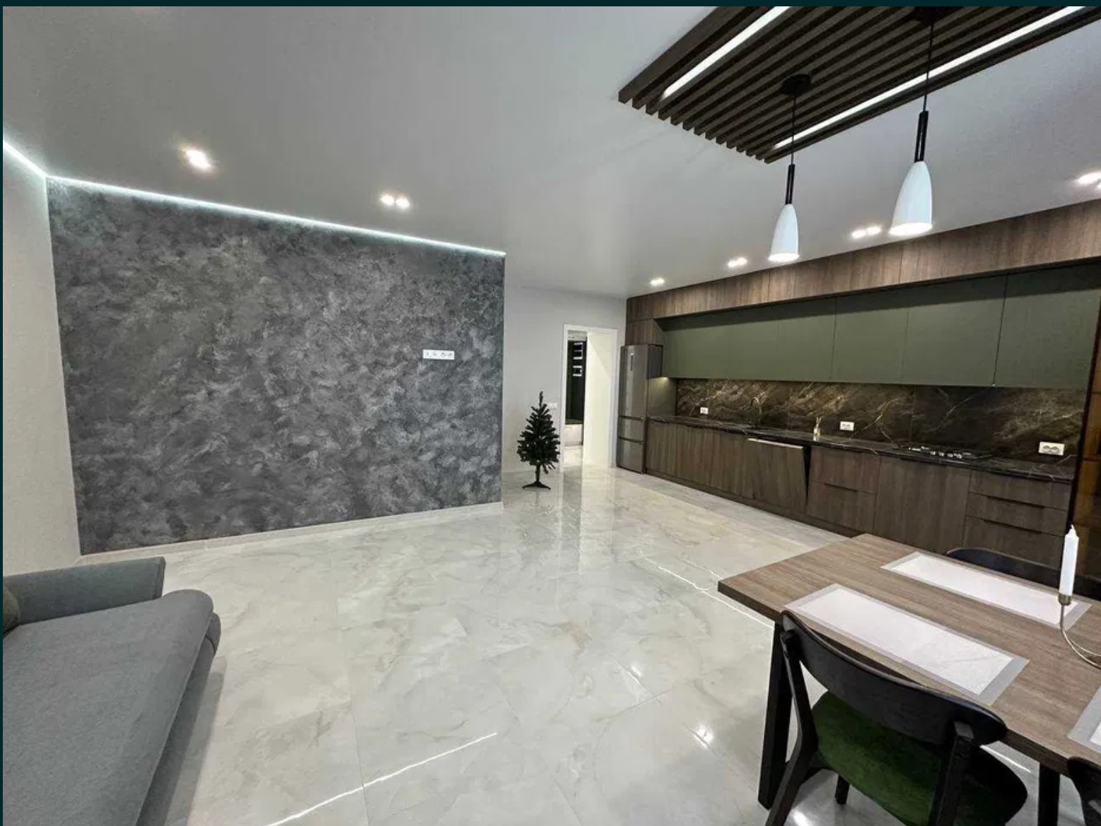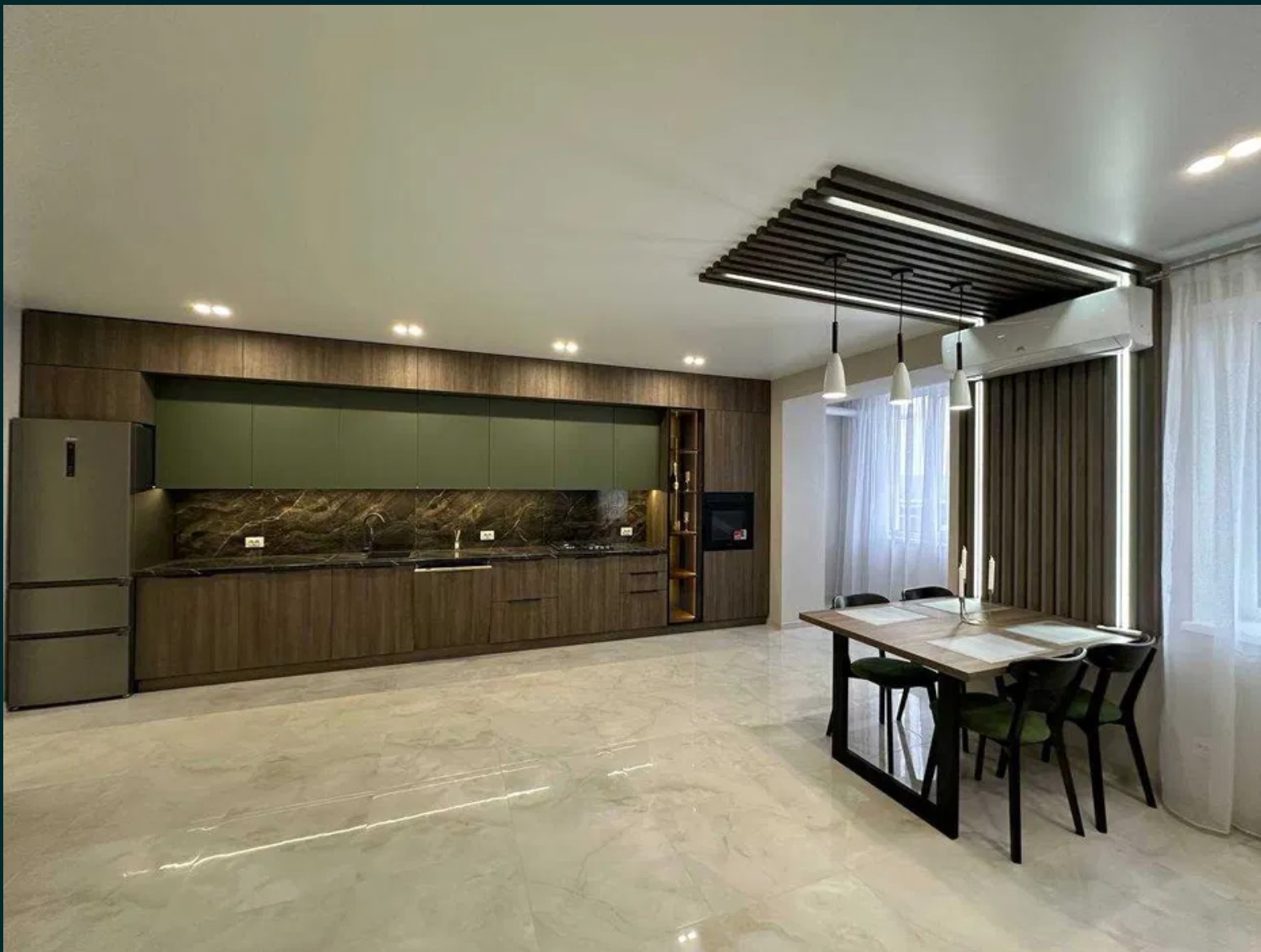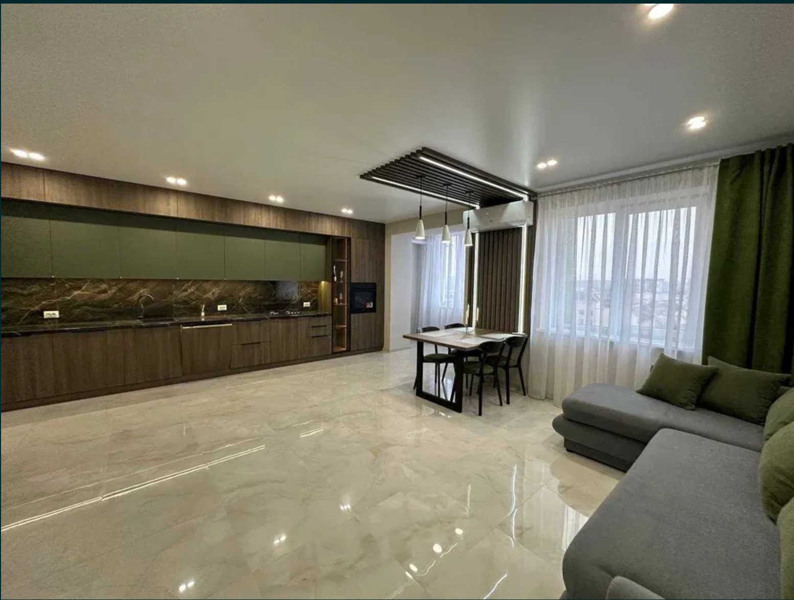 Кухня-студія повністю укомплектована меблями, наявна посудомийна машина, духова шафа, плита, холодильник, встановлено кондиціонер, облаштована обідня зона