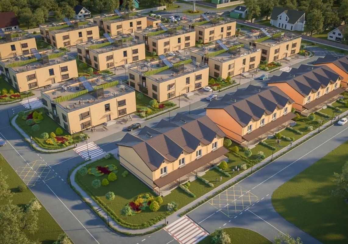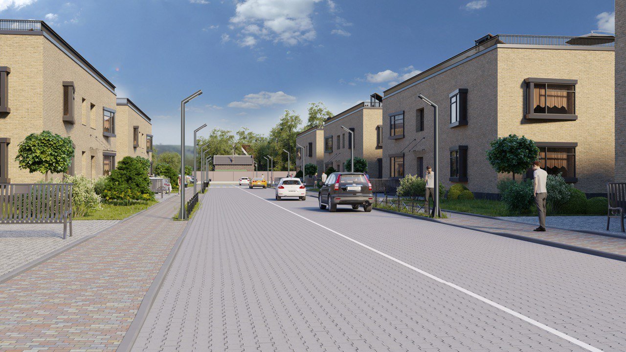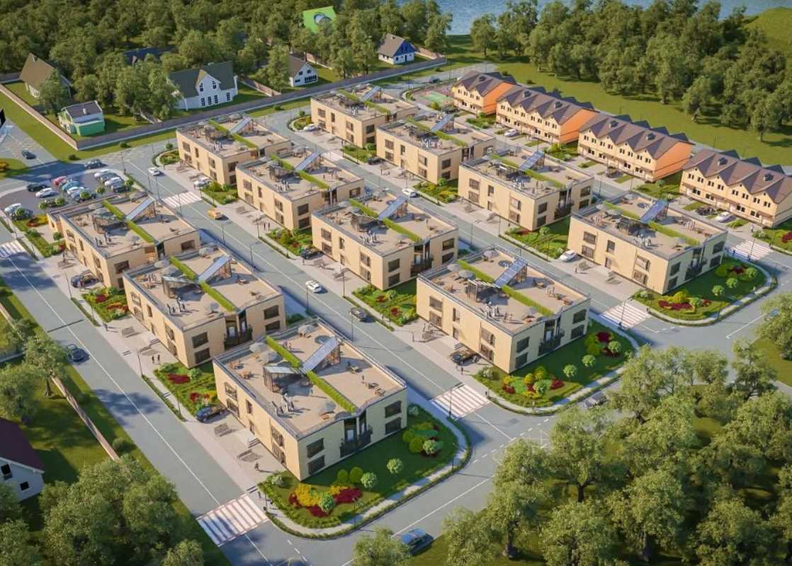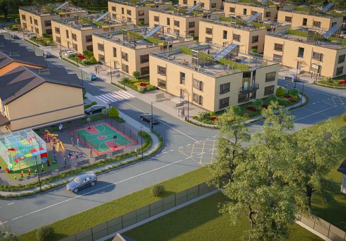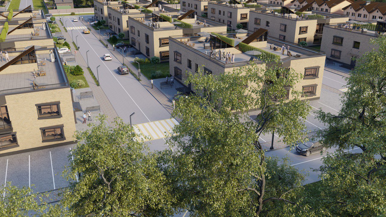Територія комплексу включає 11 двоповерхових квартирних будинків та 14 таунхаусів. Квартал передбачає зручні автомобільні проїзди, пішохідні доріжки, дитячий та спортивний майданчик. Біля кожного будинку передбачено паркомісця для автомобілів мешканців, забезпечуючи зручність та доступність паркування.